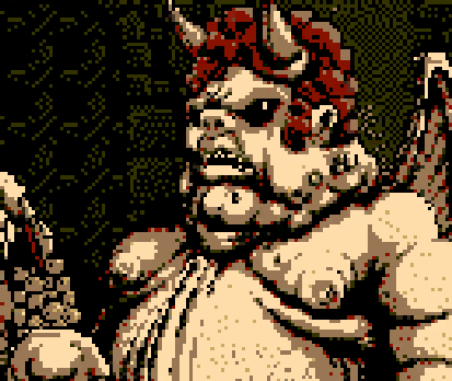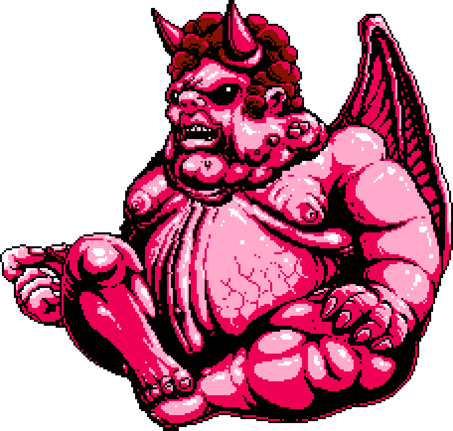 The demon's appearance resembles close to a cherub angel but in more twisted demonic way. It looks like chubby human with pink skin tone, having tiny demon horn peaking out of it head, surprisingly having nice haircut, having demon wings and large vertical lip that hide the abnormal eye hidden inside a belly.